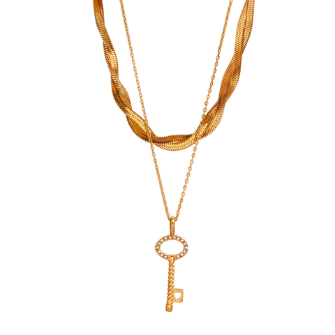 Vintage 18 Karat vergoldet Edelstahl Zirkonia Schlüssel Dick Kubanische Schlange Doppels chicht Glieder kette Anhänger Halskette Set